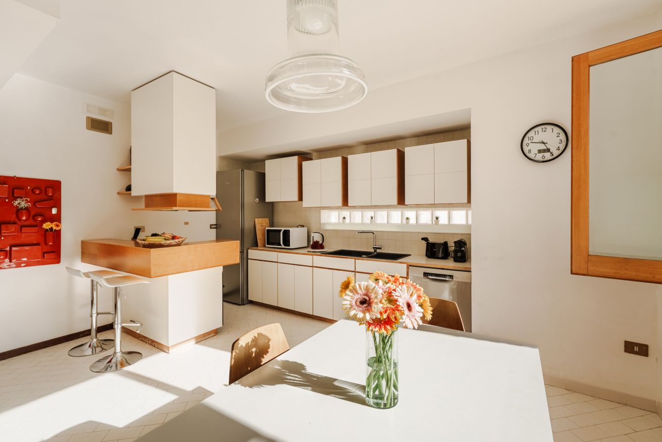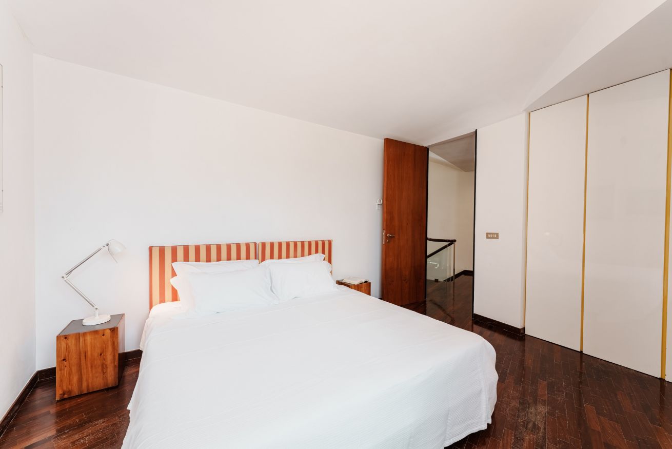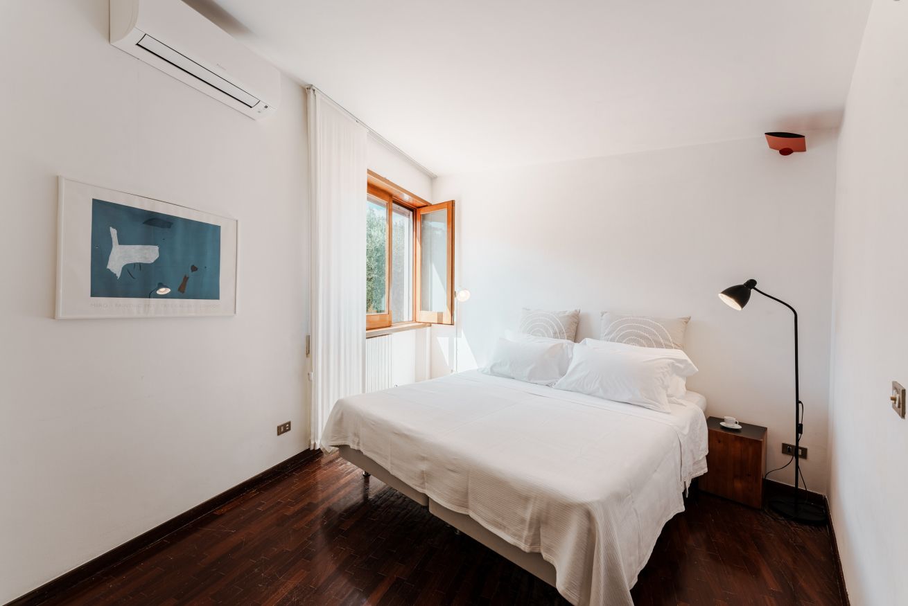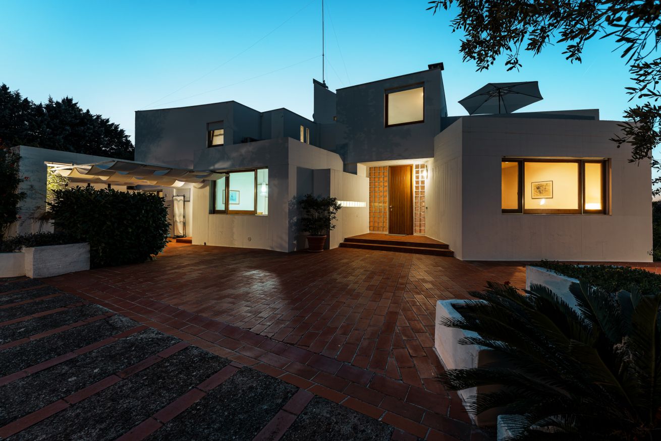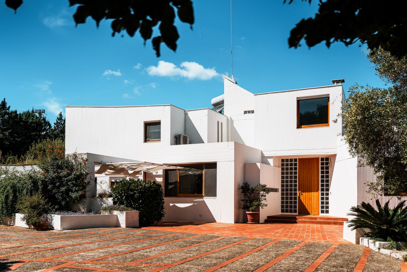 La sua architettura richiama le forme essenziali del design italiano anni ’80 (Bauhaus Movement), con spazi aperti, ampie vetrate e ambienti che dialogano con il giardino circostante. La villa si sviluppa su due livelli e accoglie fino a 10 ospiti in ambienti ampi, luminosi e funzionali.