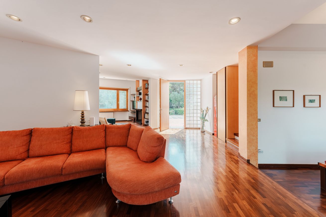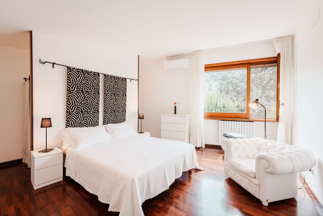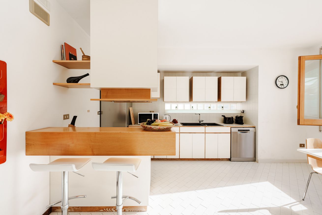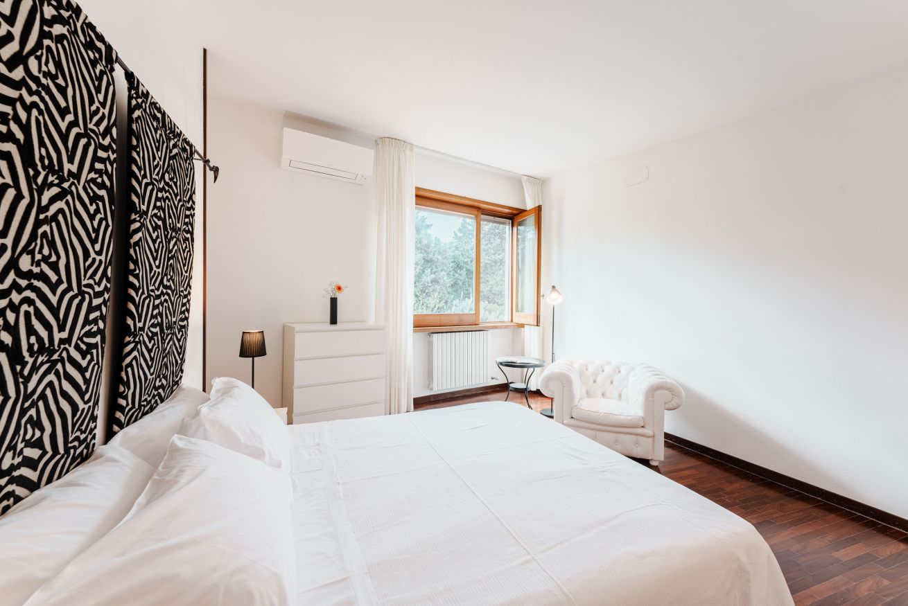 La sua architettura richiama le forme essenziali del design italiano anni ’80 (Bauhaus Movement), con spazi aperti, ampie vetrate e ambienti che dialogano con il giardino circostante. La villa si sviluppa su due livelli e accoglie fino a 10 ospiti in ambienti ampi, luminosi e funzionali.