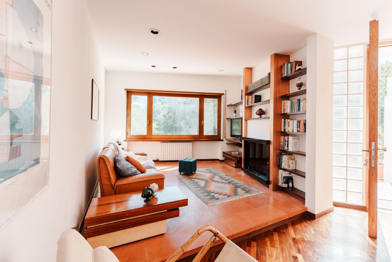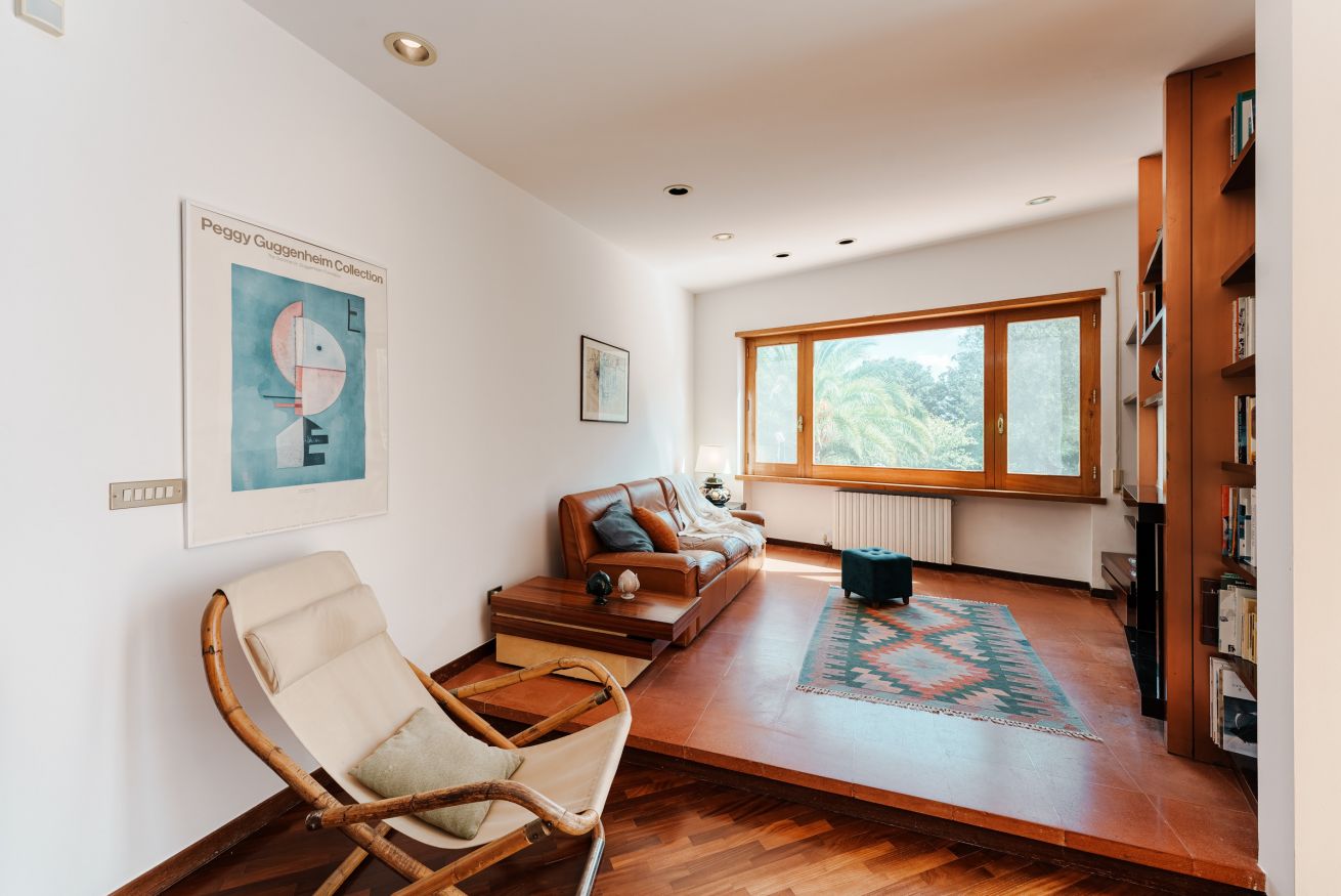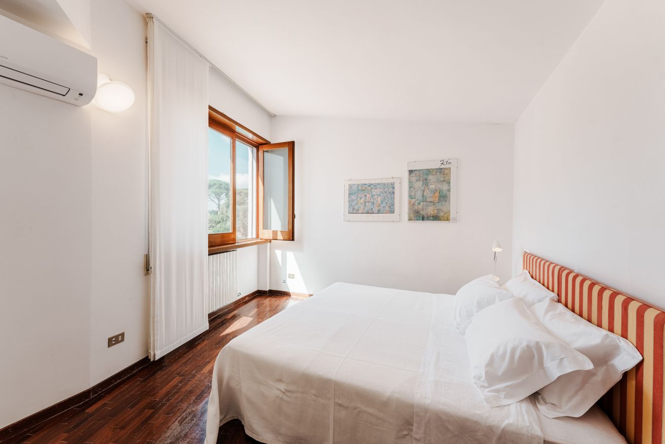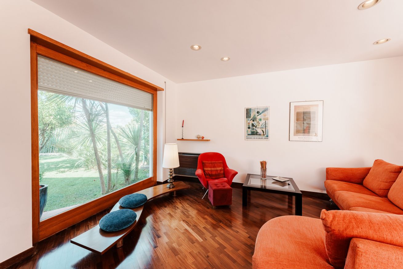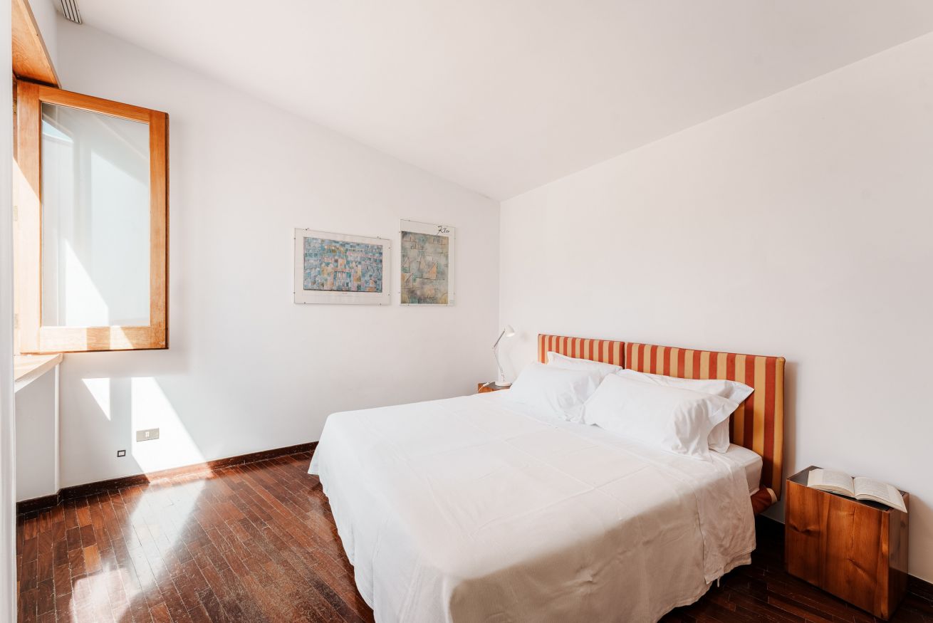 La sua architettura richiama le forme essenziali del design italiano anni ’80 (Bauhaus Movement), con spazi aperti, ampie vetrate e ambienti che dialogano con il giardino circostante. La villa si sviluppa su due livelli e accoglie fino a 10 ospiti in ambienti ampi, luminosi e funzionali.