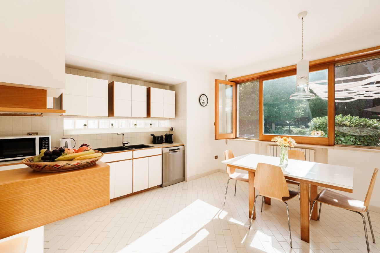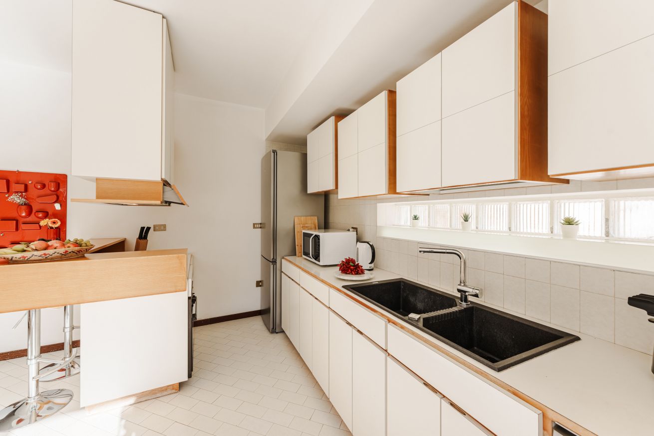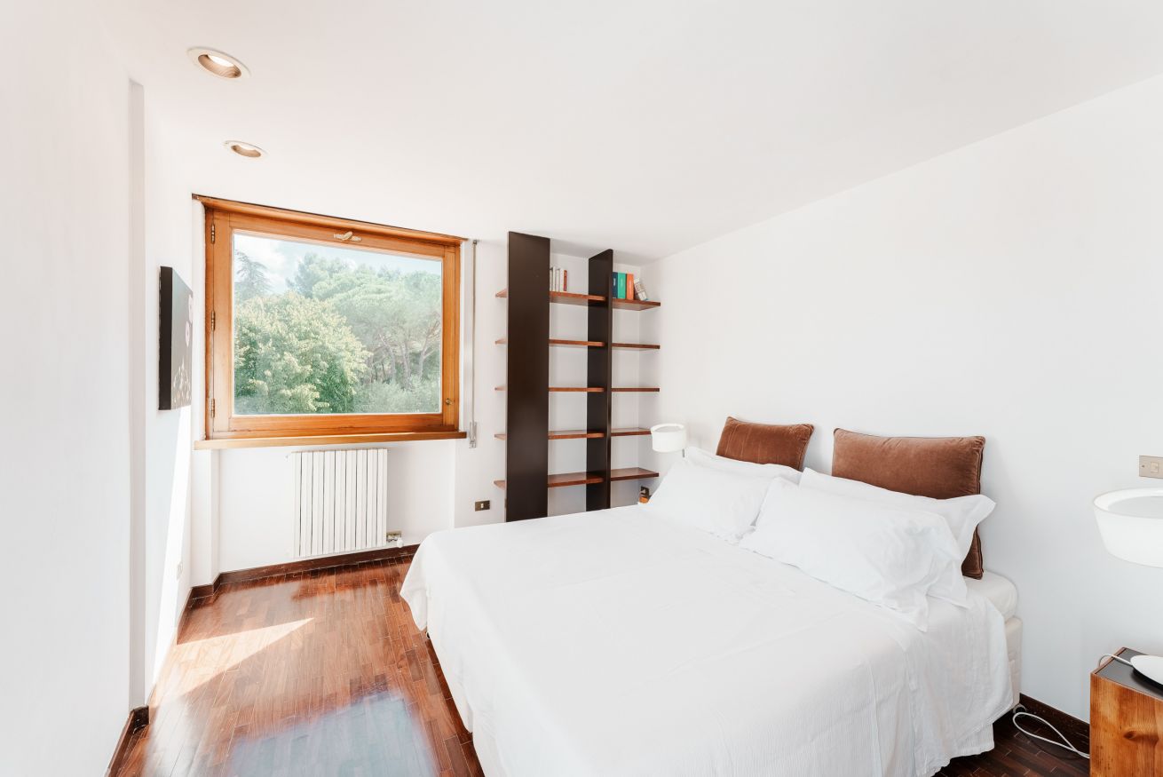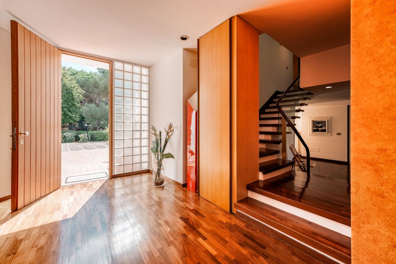 La sua architettura richiama le forme essenziali del design italiano anni ’80 (Bauhaus Movement), con spazi aperti, ampie vetrate e ambienti che dialogano con il giardino circostante. La villa si sviluppa su due livelli e accoglie fino a 10 ospiti in ambienti ampi, luminosi e funzionali.