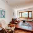 La sua architettura richiama le forme essenziali del design italiano anni ’80 (Bauhaus Movement), con ampi spazi aperti, vetrate panoramiche e ambienti che dialogano con il giardino circostante. Disposta su due livelli, offre una combinazione ben studiata di ampi spazi comuni e ambienti privati ed accoglie fino a 10 ospiti.