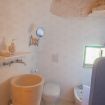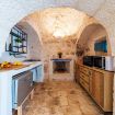 The living area, gives access to the outdoor living lounge, with in stone seatings embellished by beautiful ornaments of flowers and Mediterranean plants; whereas at the front of the Trulli home, we find a white colored wooden pavilion, perfect for enjoyable morning breakfast surrounded by pomegranate trees and rosemary plants, looking over the gorgeous private pool.