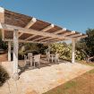 The outside of the house, on the other hand, consists of an outdoor dining area for 8 people arranged in a shaded area created by an elegant pergola, a relaxation area under a gazebo, a barbeque area and a swimming pool (8x4m) with a panoramic view of the valley that gently descends towards the sea.