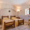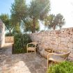 Questo trullo, ideale per due persone, si caratterizza per aver conservato tutti gli elementi del passato, nel pieno rispetto della tipicità del luogo. All'esterno è ben visibile la base rocciosa sulla quale venivano anticamente costruiti i trulli, inoltre, questa dependance è arricchita da un bellissimo tavolo in pietra con vista panoramica all'ombra di alcuni alberi del giardino.