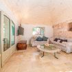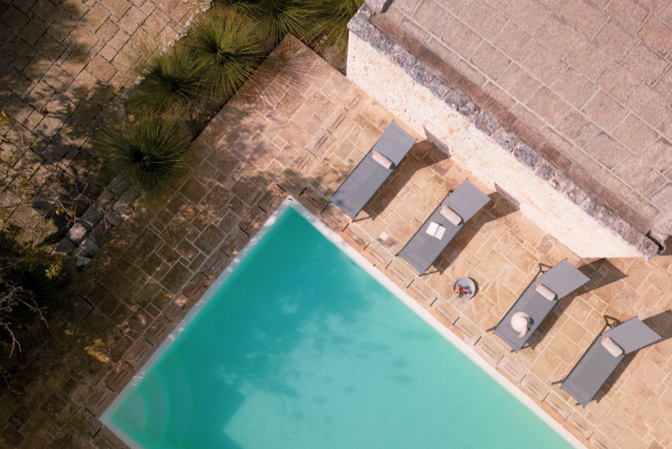 All'interno, la disposizione favorisce sia la convivialità che la privacy. La zona giorno si apre su una veranda a volta che guarda sulla corte privata e sulla piscina. Le pareti in pietra e l’antico forno a legna raccontano la storia del luogo, aggiungendo calore ad ogni ambiente.