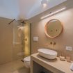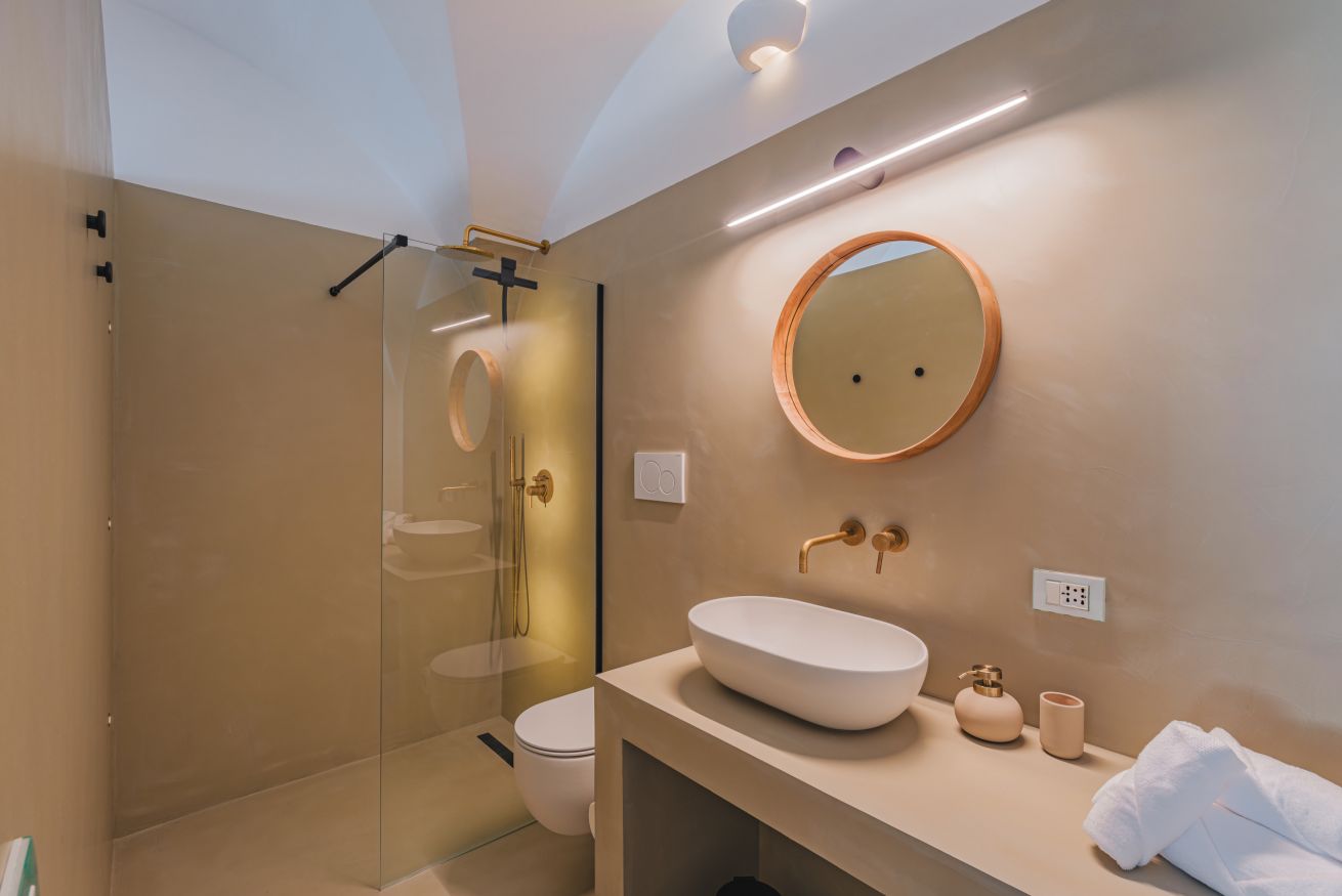 • Terra & Fuoco: comprende un’ampia suite matrimoniale con angolo cottura, area pranzo e salottino con smart TV (il divano può diventare letto singolo). Attraverso un suggestivo corridoio interno scavato nella roccia, si raggiunge la seconda camera con due futon singoli, angolo breakfast con piastra a induzione e bollitore, e bagno completo con doccia e vasca. Un ulteriore bagno con doccia ospita anche la lavanderia con lavatrice e asciugatrice.