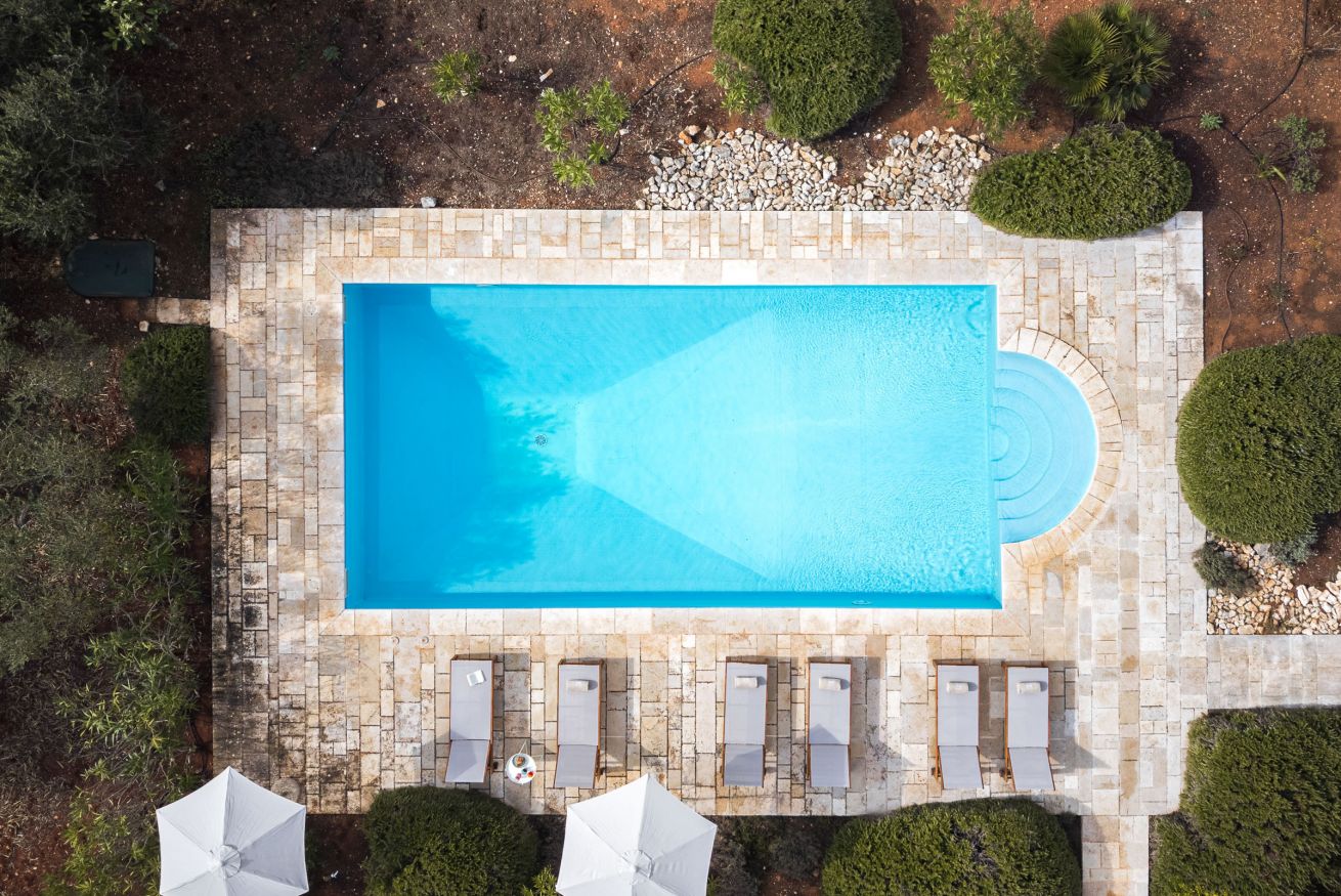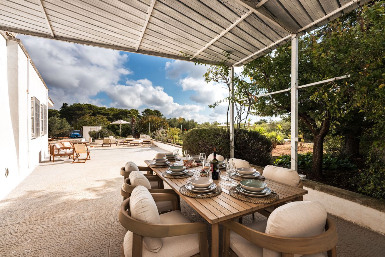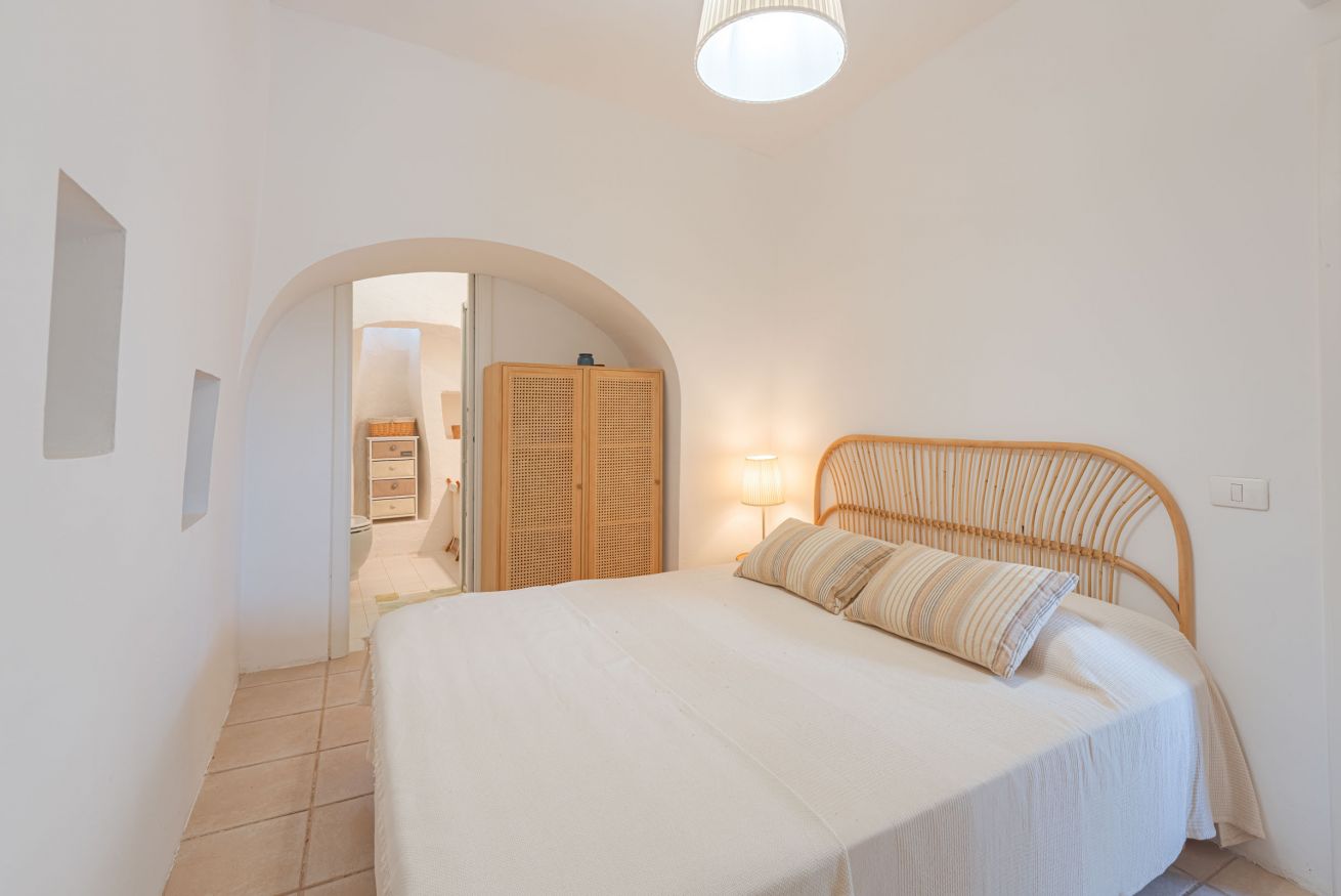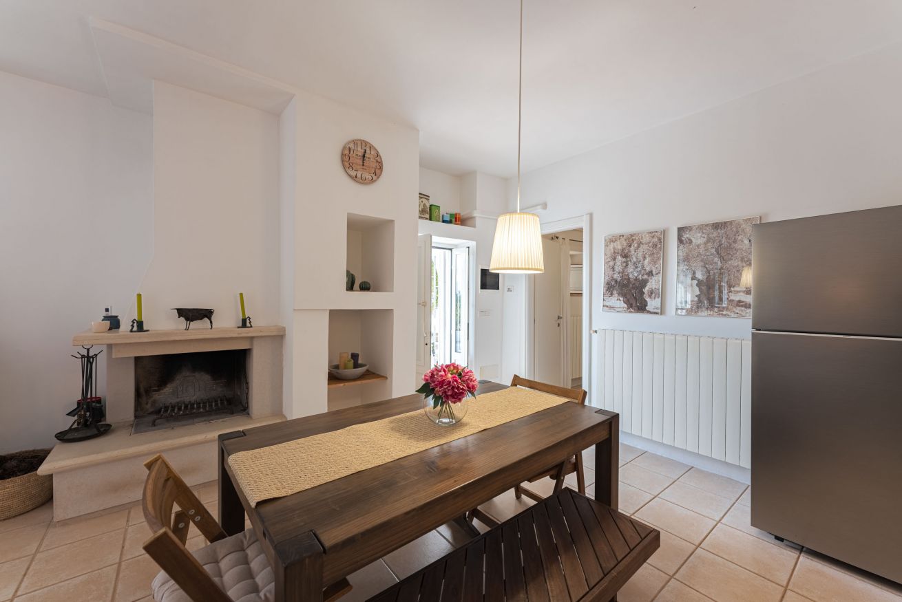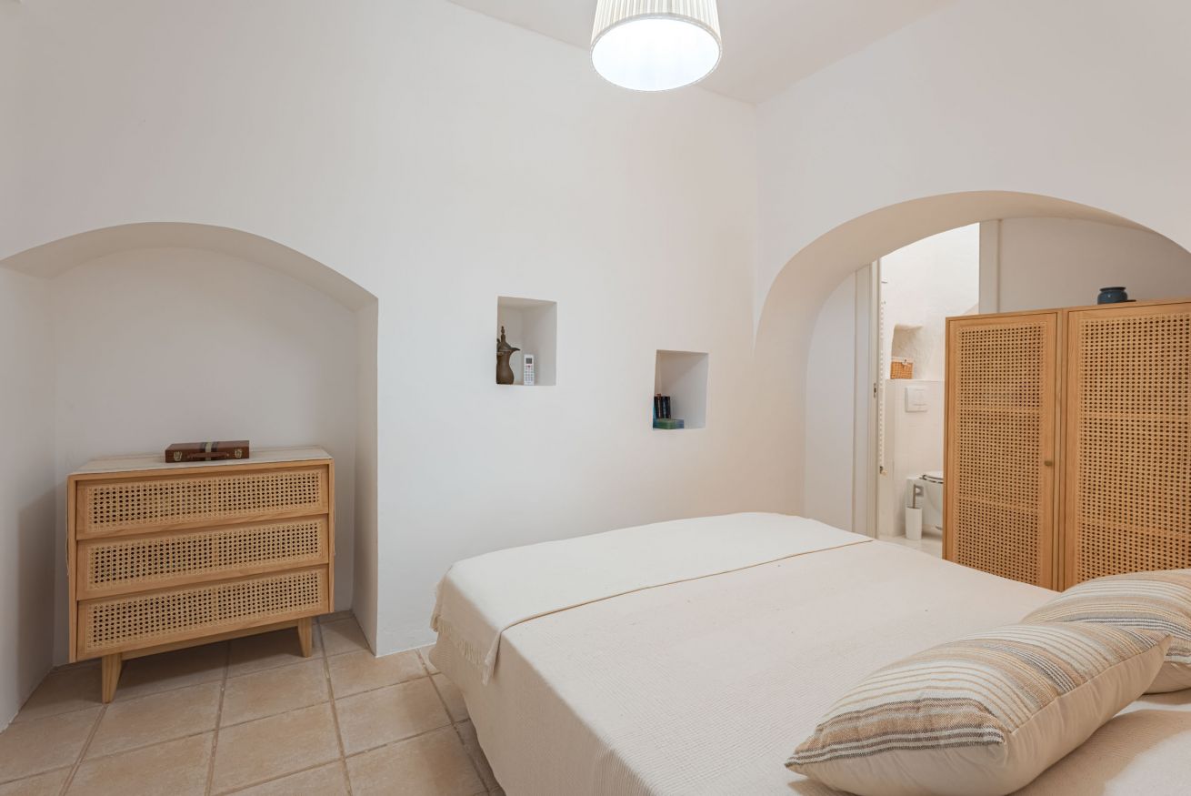 Di fronte alla veranda ombreggiata — collegata comodamente alla cucina — una piscina privata incastonata nel verde diventa il fulcro della giornata. All’interno, la disposizione favorisce convivialità e privacy per due coppie o una famiglia. Gli ambienti richiamano la tradizione con archi e nicchie tipiche delle lamie bianche, conservando autenticità e semplicità.