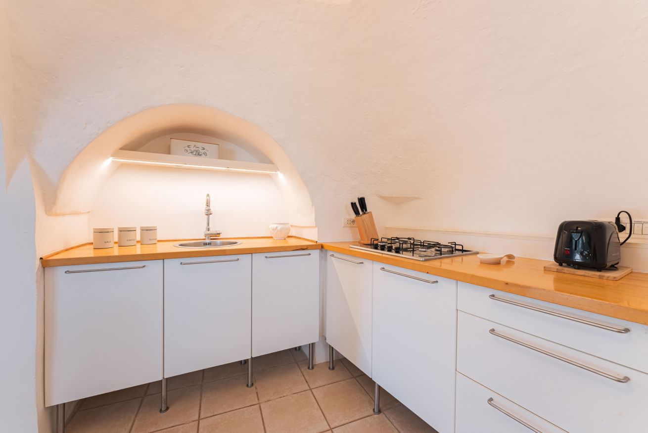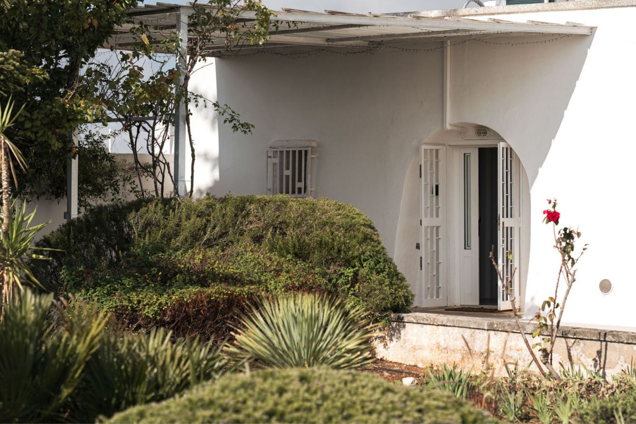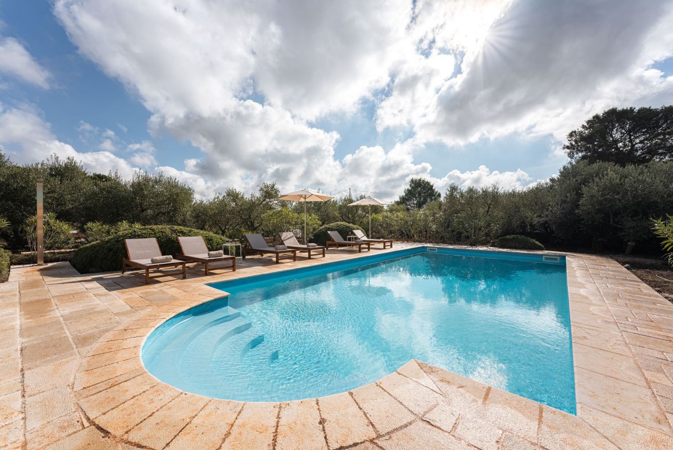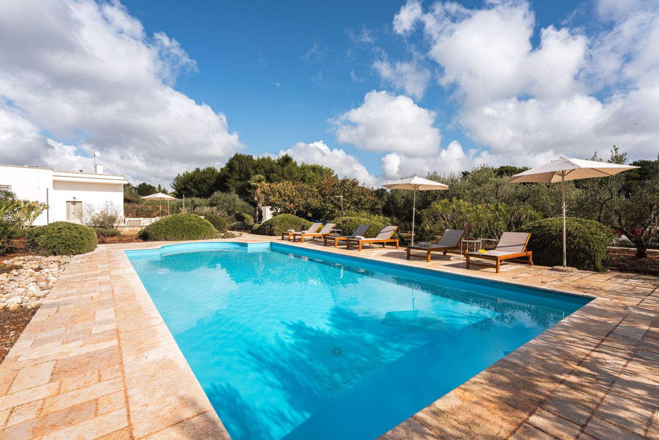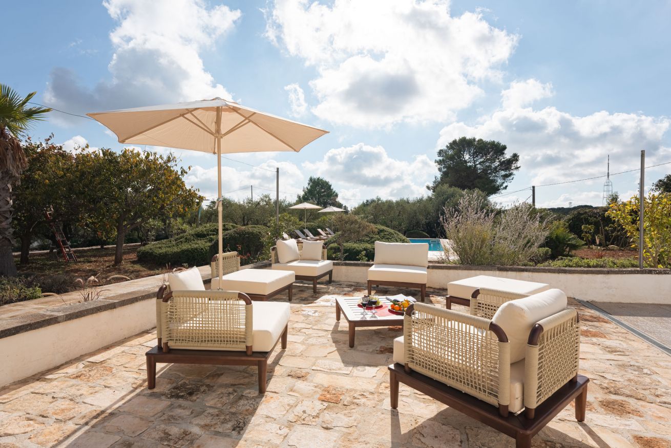 Di fronte alla veranda ombreggiata — collegata comodamente alla cucina — una piscina privata incastonata nel verde diventa il fulcro della giornata. All’interno, la disposizione favorisce convivialità e privacy per due coppie o una famiglia. Gli ambienti richiamano la tradizione con archi e nicchie tipiche delle lamie bianche, conservando autenticità e semplicità.