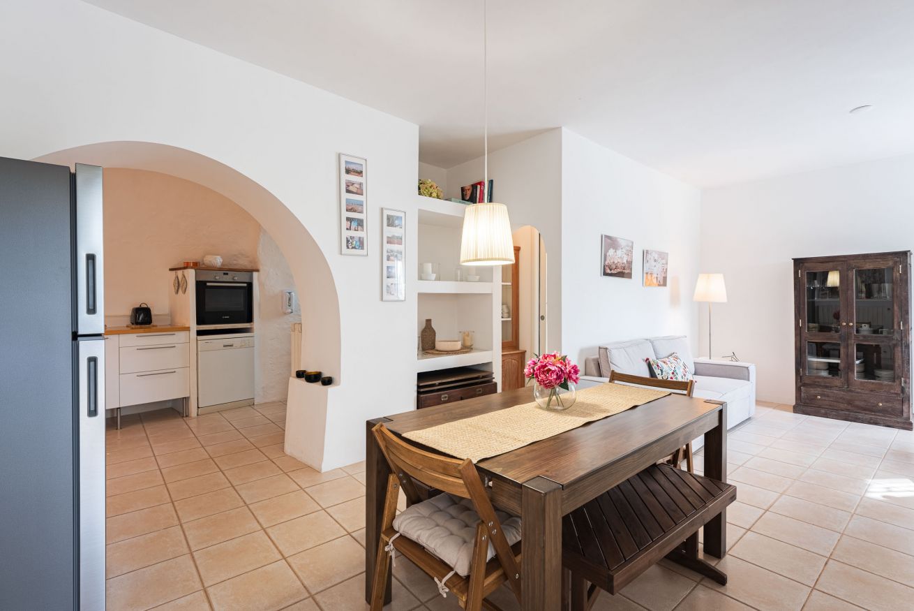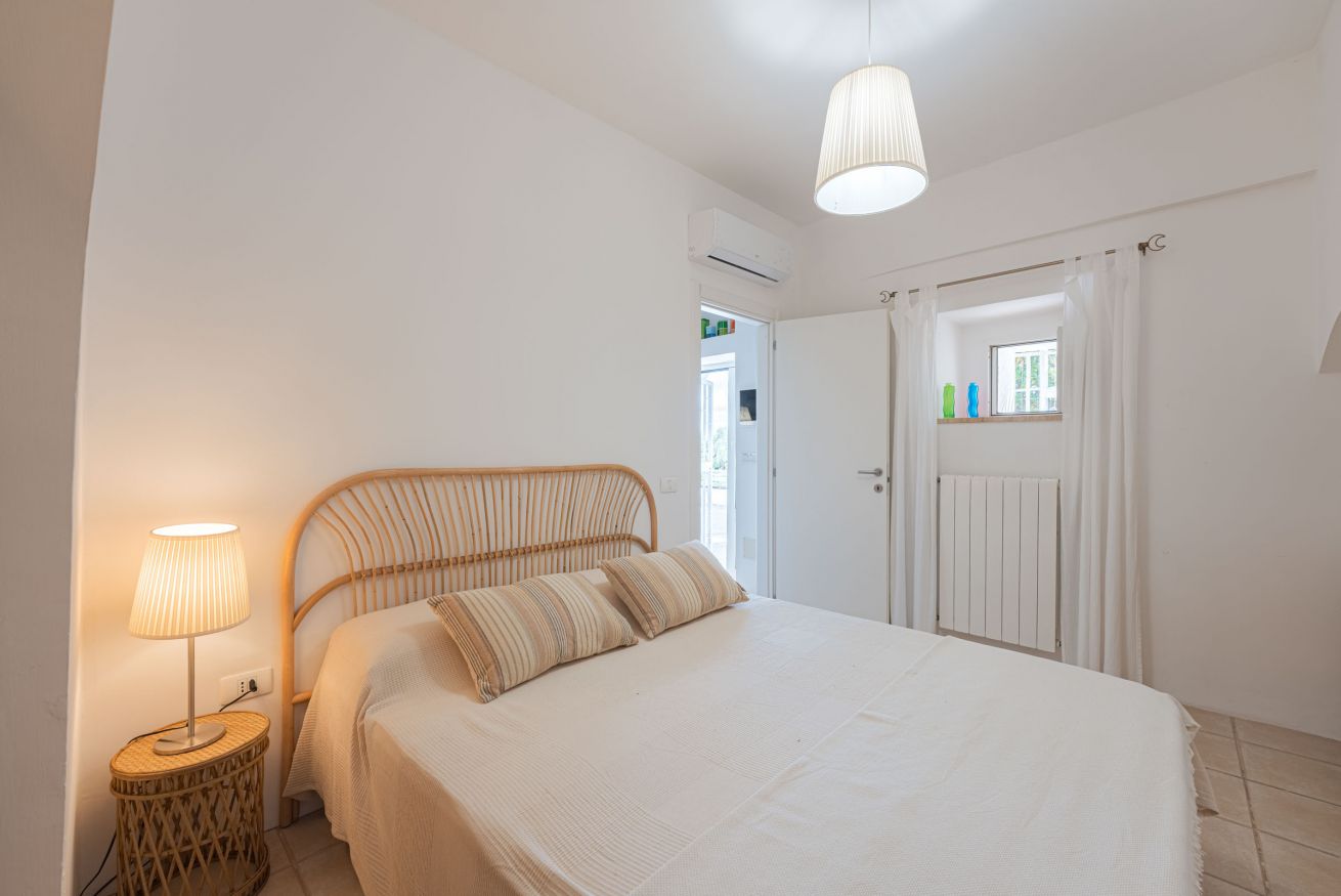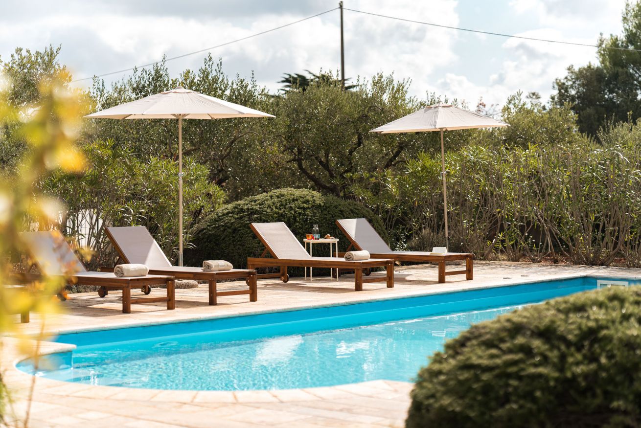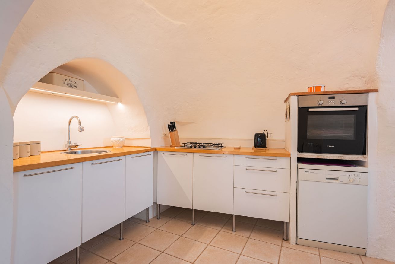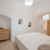 Di fronte alla veranda ombreggiata — collegata comodamente alla cucina — una piscina privata incastonata nel verde diventa il fulcro della giornata. All’interno, la disposizione favorisce convivialità e privacy per due coppie o una famiglia. Gli ambienti richiamano la tradizione con archi e nicchie tipiche delle lamie bianche, conservando autenticità e semplicità.