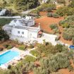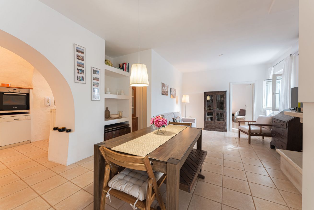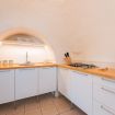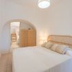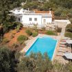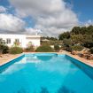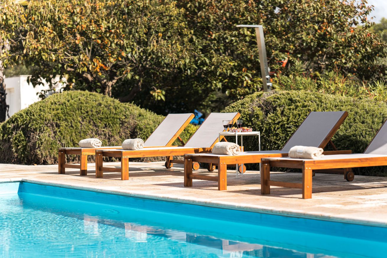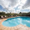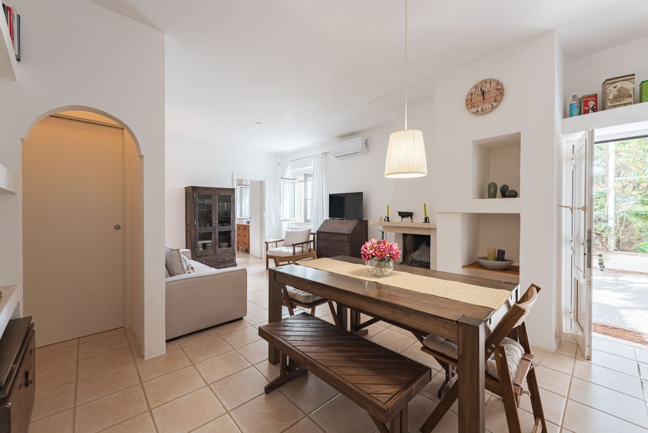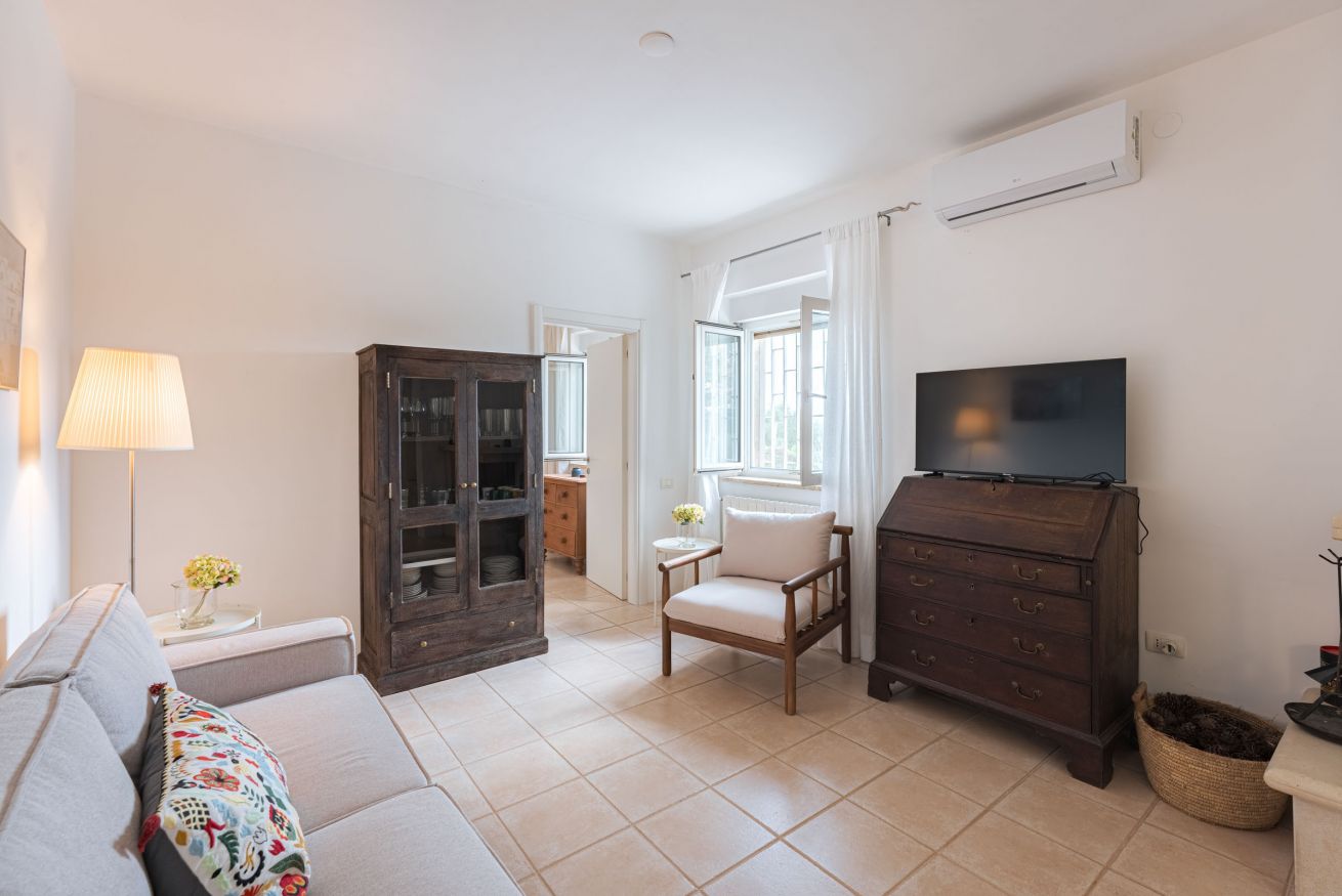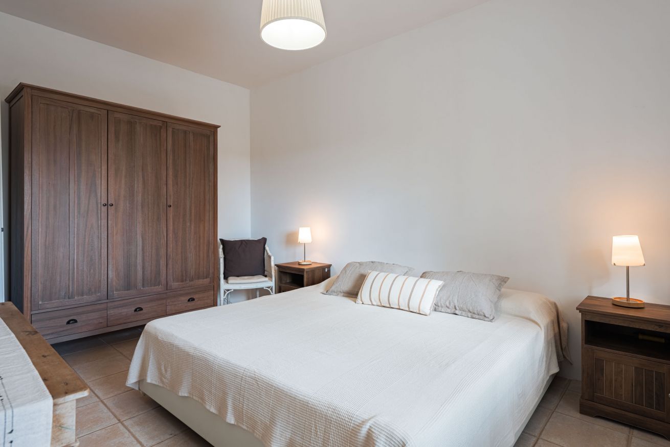 Di fronte alla veranda ombreggiata — collegata comodamente alla cucina — una piscina privata incastonata nel verde diventa il fulcro della giornata. All’interno, la disposizione favorisce convivialità e privacy per due coppie o una famiglia. Gli ambienti richiamano la tradizione con archi e nicchie tipiche delle lamie bianche, conservando autenticità e semplicità.
