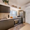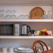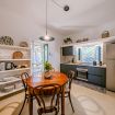La cucina, ben attrezzata con lavastoviglie, microonde, macchina del caffè, bollitore e tostapane comunica con il gazebo esterno e dispone di un bagno di servizio con doccia e lavatrice.