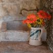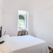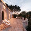Nel cuore di Laureto, immerso nel verde rigoglioso della campagna pugliese, sorge un’incantevole villa in pietra costituita da 5 trulli, simbolo senza tempo della tradizione locale. I suoi caratteristici coni, affrescati con delicate tonalità pastello, si innalzano verso il cielo azzurro, creando un affascinante contrasto con il bianco delle pareti. Questi affreschi, ispirati alla natura, aggiungono un tocco artistico unico, rendendo il trullo un vero e proprio gioiello architettonico. La terrazza in pietra con la sua caratteristica forma a semicerchio è rimasta intatta per più di cento anni, la sua forma e le pietre originali riportano indietro nel tempo in un’atmosfera magica.