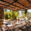 Le zone esterne circondate dal verde sono molto ben curate e assicurano un tranquillo rifugio per godere di un buon libro, bere un bicchiere di vino o semplicemente ammirare il panorama mozzafiato. Il gazebo davanti alla cucina dispone di un grande tavolo di legno e il barbecue completato da lavandino in pietra e piano d’appoggio.