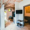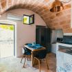All’interno della unità più moderna si viene subito accolti da un luminoso open space che unisce il living alla cucina e comunica con il giardino attraverso delle ampie finestre. La cucina, ampiamente attrezzata con tutto il necessario per gustare le tipicità della gastronomia pugliese, è arricchita da elementi di design e si completa con un tavolo da pranzo e con un angolo relax con TV satellitare.